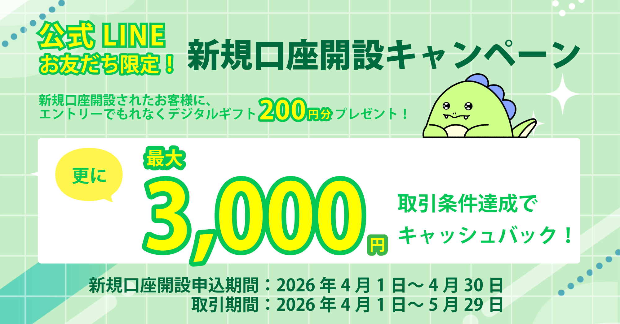 2026年4月は以下のキャンペーンを開催いたします。 ぜひ外為ファイネストMT5・MT4をご利用ください。 ①公式LINEお友だち限定!新規口座開設キャンペーン https://www.gaitamefinest.com/campaign/linenew202604 ②法人プレゼントキャンペーン https://www.gaitamefinest.com/campaign/houjin202604