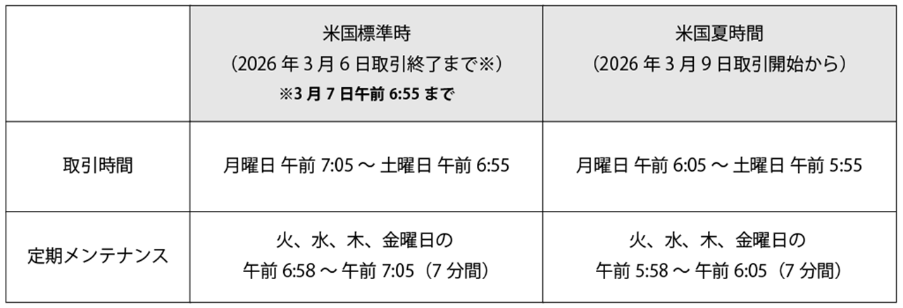 米国夏時間への移行に伴い、2026年3月9日(月)より、取引時間およびメンテナンス時間が以下の通り変更されます。お取引の際には十分ご注意いただきますようお願いいたします。